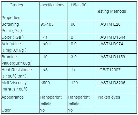 This product is obtained from hydrogenation of melted light color C5 petroleum resin. It appears to be water white and emits no odor. When molten it appears transparent. It exhibits excellent age resistance and improve the adhesive property. It shows a good compatibility with a wide variety of elastomer including Ethylene Vinyl Acetate (EVA) and styrenic block copolymer such as SIS and SBS, etc.